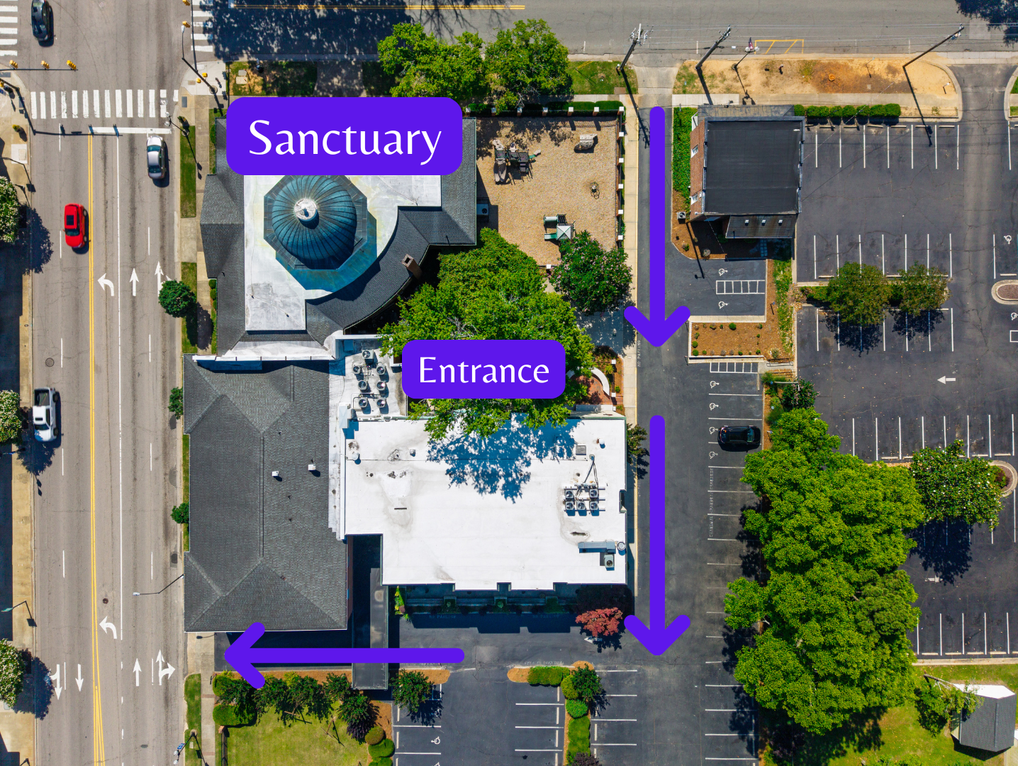 Please note the map on the right, which shows our one-way traffic flow in the parking lot.